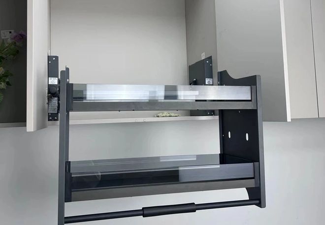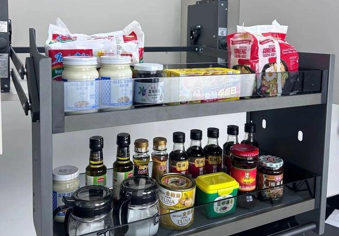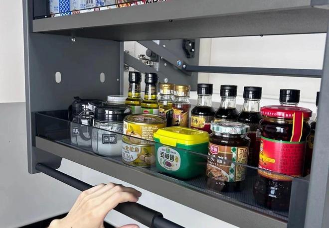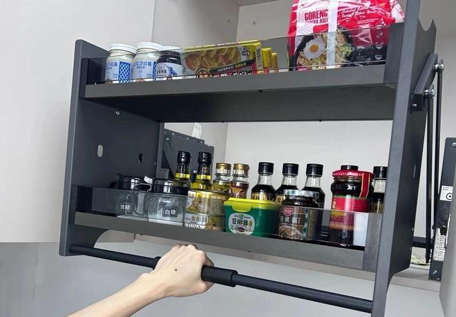 拉篮,一般分为2~3层,上层用来放调料,中间放酱料,下层放油。而且,是采用的液压缓冲设计,轻轻一拉就平稳升降。