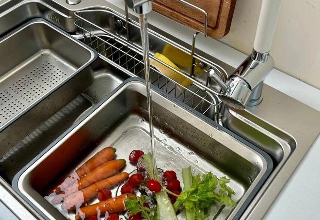 在我体验完以后,我发现这种一体化的水槽真的很好用。洗完的蔬菜水果,可以直接放在沥水板上控水,然后再推到切菜区,这样就省去了另外准备沥水篮的步骤。