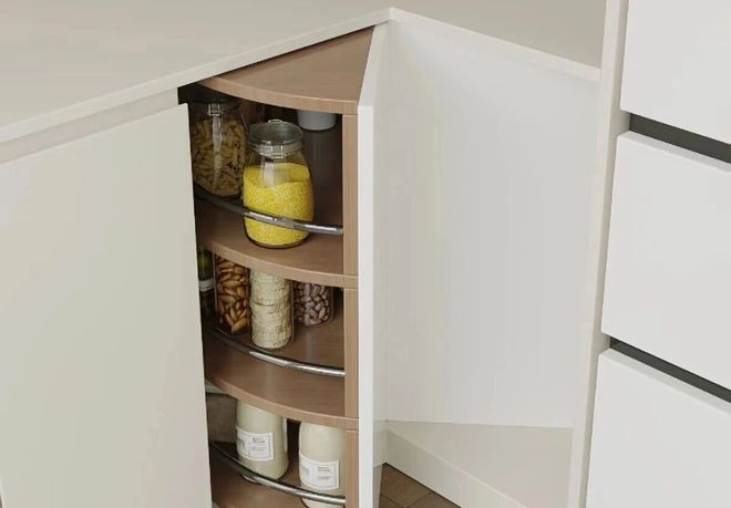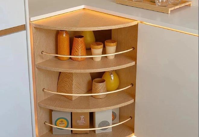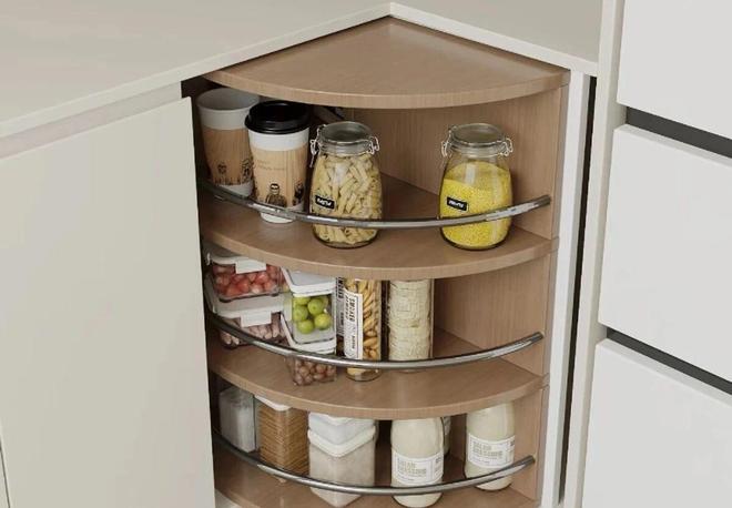 看看现在流行的神设计:旋转式角落柜。将传统的死角角落。改造成旋转式的储物系统。整体设计是采用的双翼旋转设计开启式。两侧储物架同时旋出形成u型操作面。而且,内部有分区收纳系统,每层高度又可以调节,还配备阻尼缓冲系统。